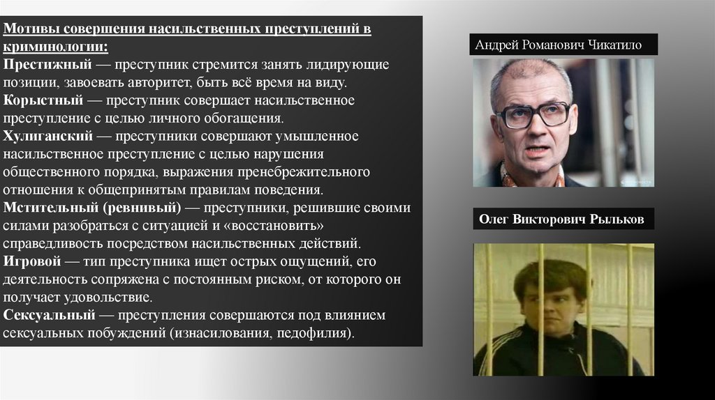 МотивыНасилие в насильственных преступлениях может служить как самоцелью, так и