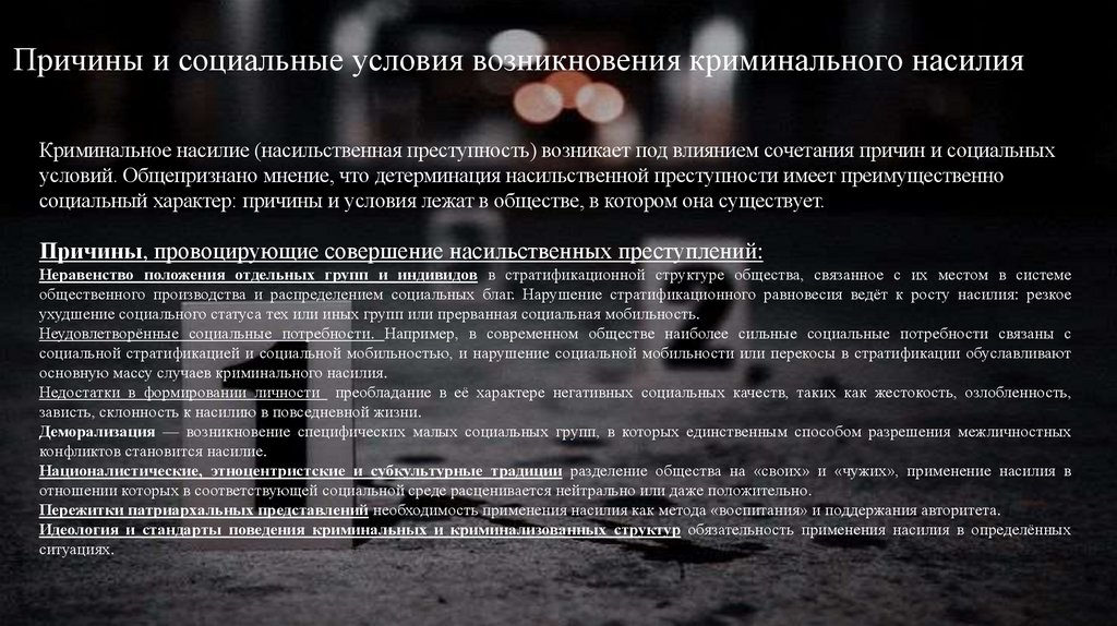 Причины и социальные условия возникновения криминального насилияКриминальное насилие (насильственная преступность) возникает под влиянием сочетания причин и социальных