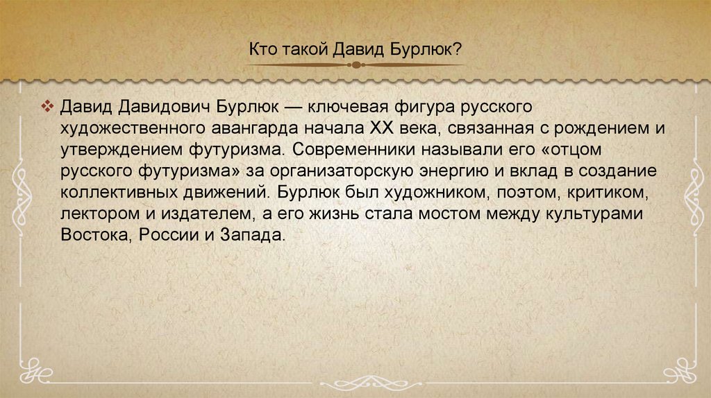 Кто такой Давид Бурлюк?Давид Давидович Бурлюк — ключевая фигура русского