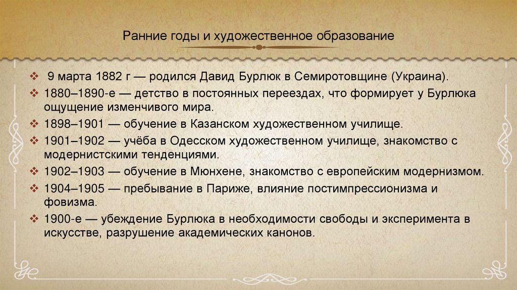 Ранние годы и художественное образование9 марта 1882 г — родился Давид Бурлюк в Семиротовщине (Украина).