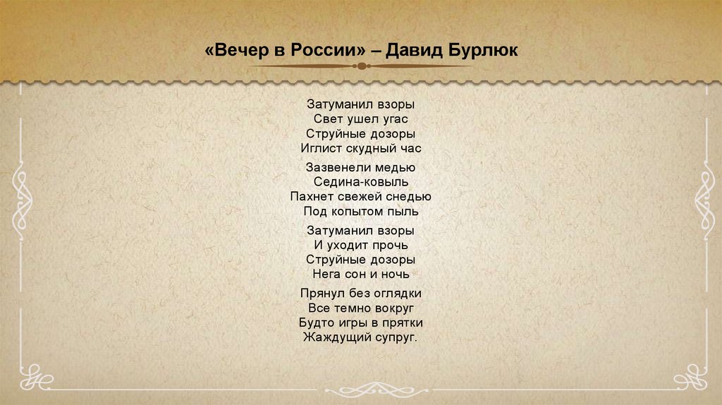 «Вечер в России» – Давид БурлюкЗатуманил взоры