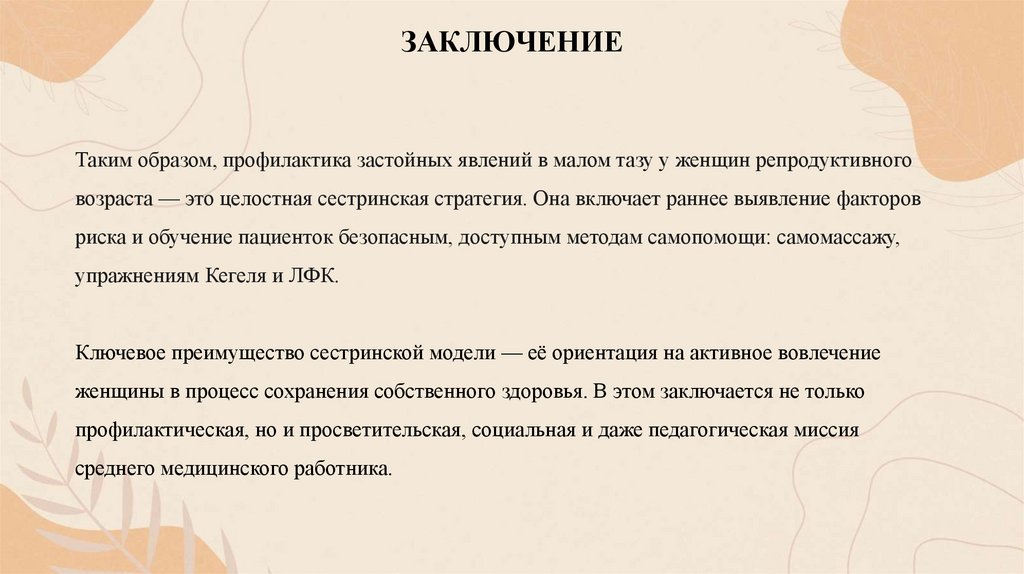 ЗАКЛЮЧЕНИЕТаким образом, профилактика застойных явлений в малом тазу у женщин репродуктивного