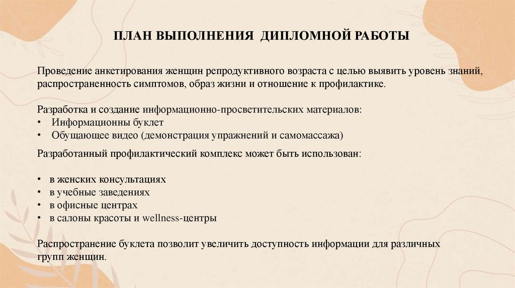 ПЛАН ВЫПОЛНЕНИЯ ДИПЛОМНОЙ РАБОТЫПроведение анкетирования женщин репродуктивного возраста с целью выявить уровень знаний,