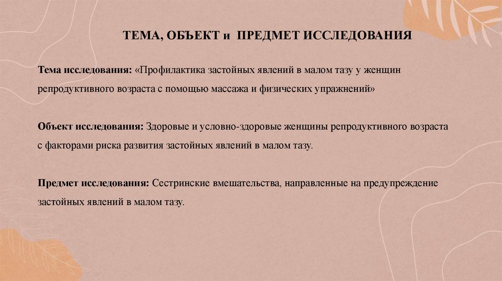 ТЕМА, ОБЪЕКТ и ПРЕДМЕТ ИССЛЕДОВАНИЯТема исследования: «Профилактика застойных явлений в малом тазу у женщин