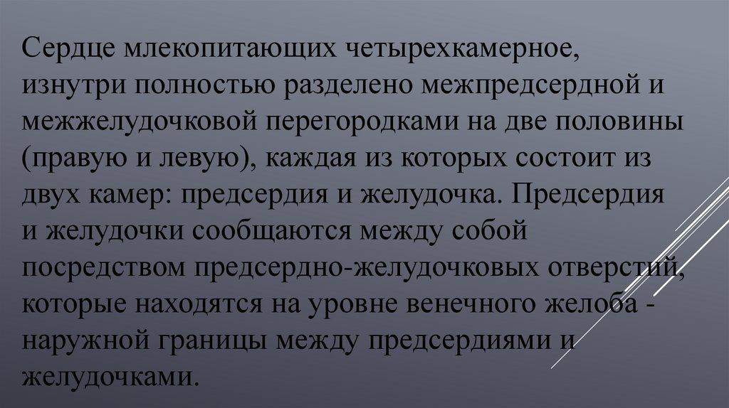 Сердце млекопитающих четырехкамерное,изнутри полностью разделено межпредсердной и