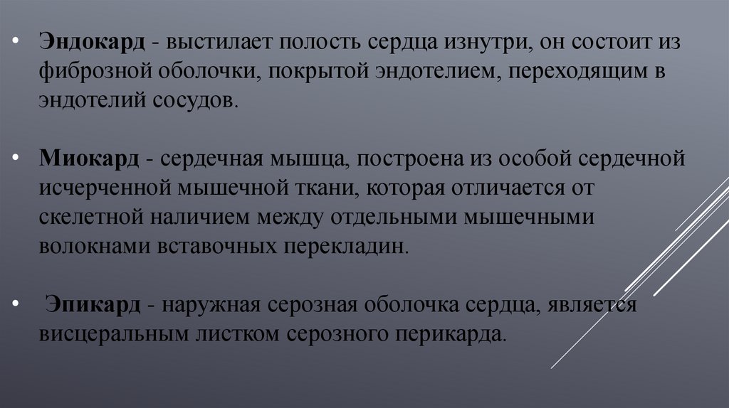 • Эндокард - выстилает полость сердца изнутри, он состоит изфиброзной оболочки, покрытой эндотелием, переходящим в