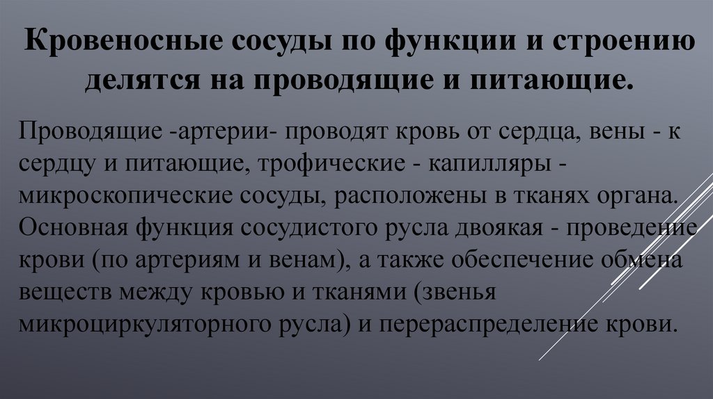 Кровеносные сосуды по функции и строениюделятся на проводящие и питающие.