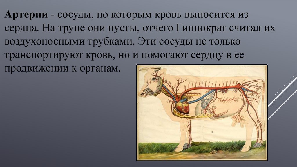 Артерии - сосуды, по которым кровь выносится изсердца. На трупе они пусты, отчего Гиппократ считал их