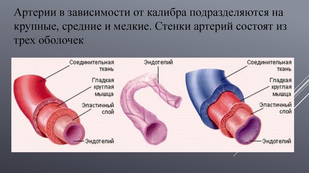 Артерии в зависимости от калибра подразделяются накрупные, средние и мелкие. Стенки артерий состоят из