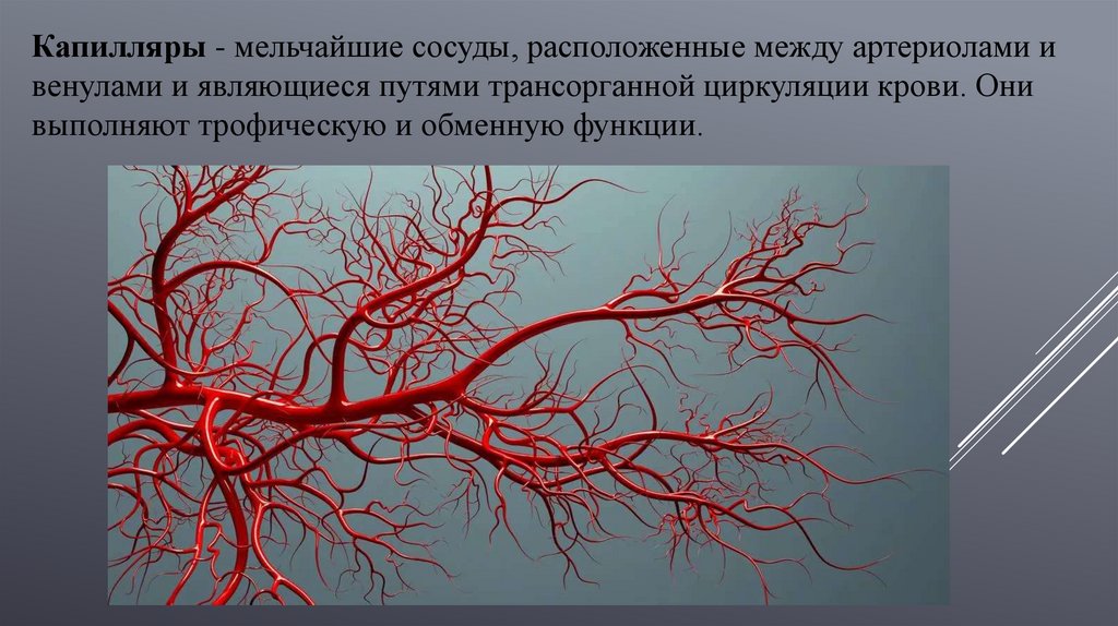 Капилляры - мельчайшие сосуды, расположенные между артериолами ивенулами и являющиеся путями трансорганной циркуляции крови. Они