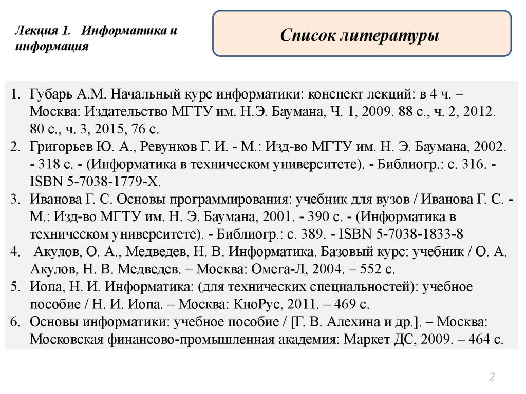 1. Губарь А.М. Начальный курс информатики: конспект лекций: в 4 ч. –