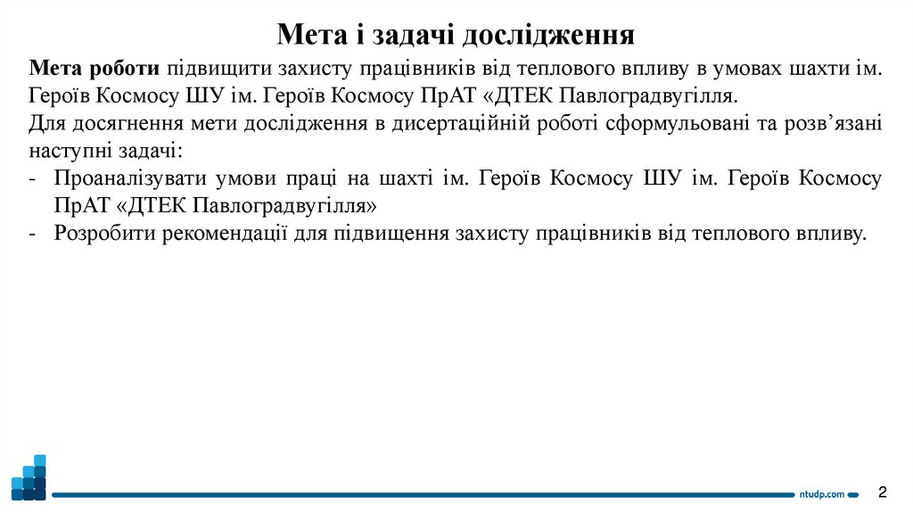 Мета і задачі дослідженняМета роботи підвищити захисту працівників від теплового впливу в умовах шахти ім.