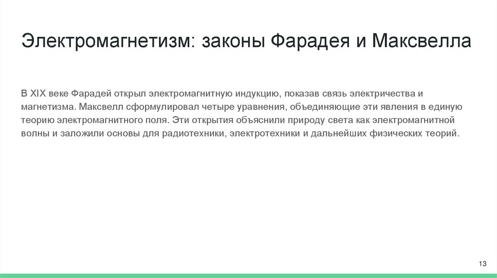 Электромагнетизм: законы Фарадея и МаксвеллаВ XIX веке Фарадей открыл электромагнитную индукцию, показав связь электричества и