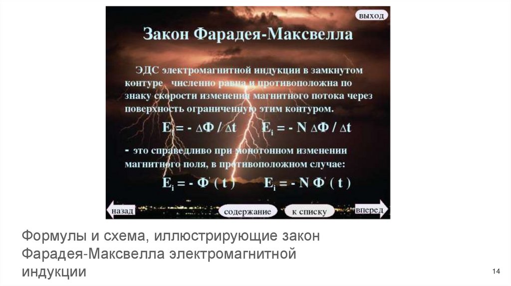 Формулы и схема, иллюстрирующие законФарадея-Максвелла электромагнитной