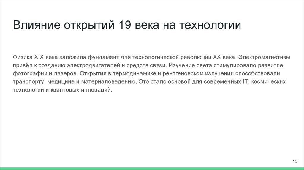 Влияние открытий 19 века на технологииФизика XIX века заложила фундамент для технологической революции XX века. Электромагнетизм