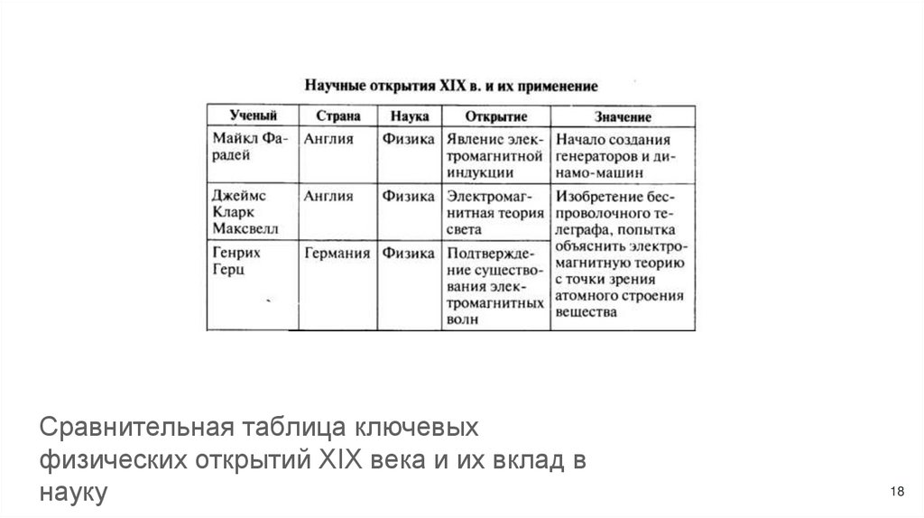 Сравнительная таблица ключевыхфизических открытий XIX века и их вклад в
