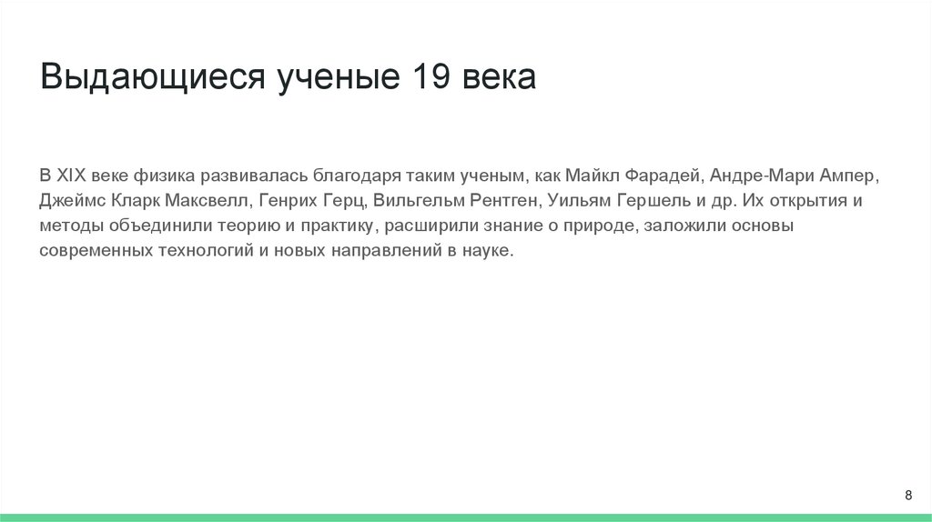 Выдающиеся ученые 19 векаВ XIX веке физика развивалась благодаря таким ученым, как Майкл Фарадей, Андре-Мари Ампер,