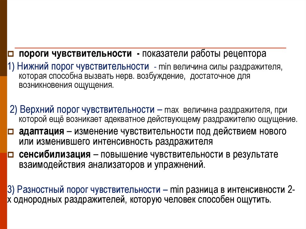 пороги чувствительности - показатели работы рецептора1) Нижний порог чувствительности - min величина силы раздражителя,