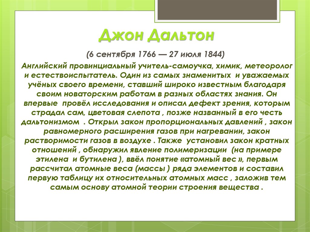 Джон Дальтон – английский физик и химик, на протяжении жизни изучал