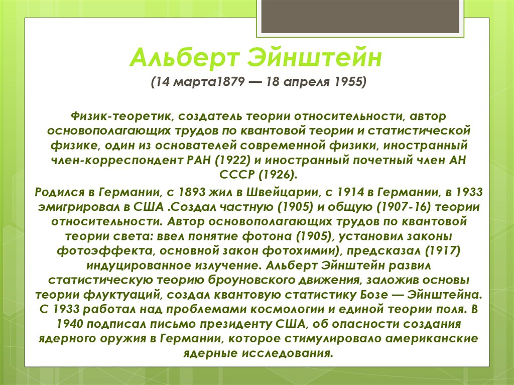 Альберт Эйнштейн – немецкий физик, изложивший и обосновавший