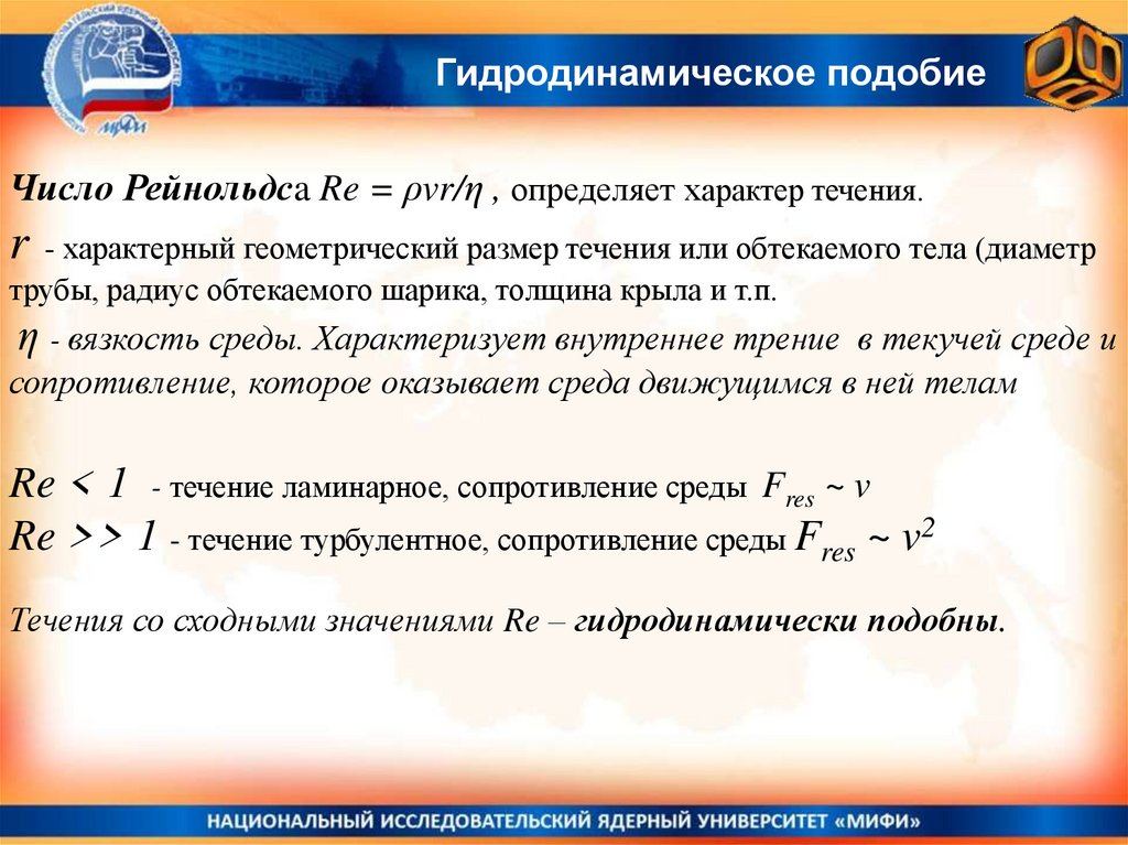 Гидродинамическое подобиеЧисло Рейнольдсa Re = ρvr/η , определяет характер течения.