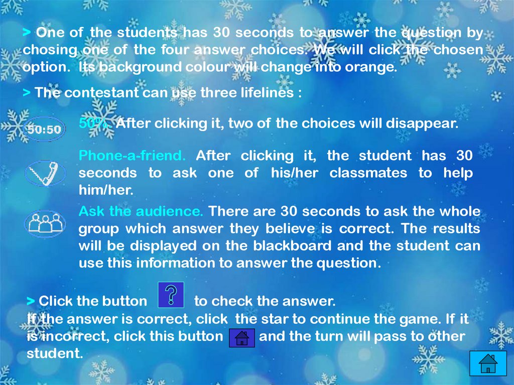 > One of the students has 30 seconds to answer the question bychosing one of the four answer choices. We will click the chosen