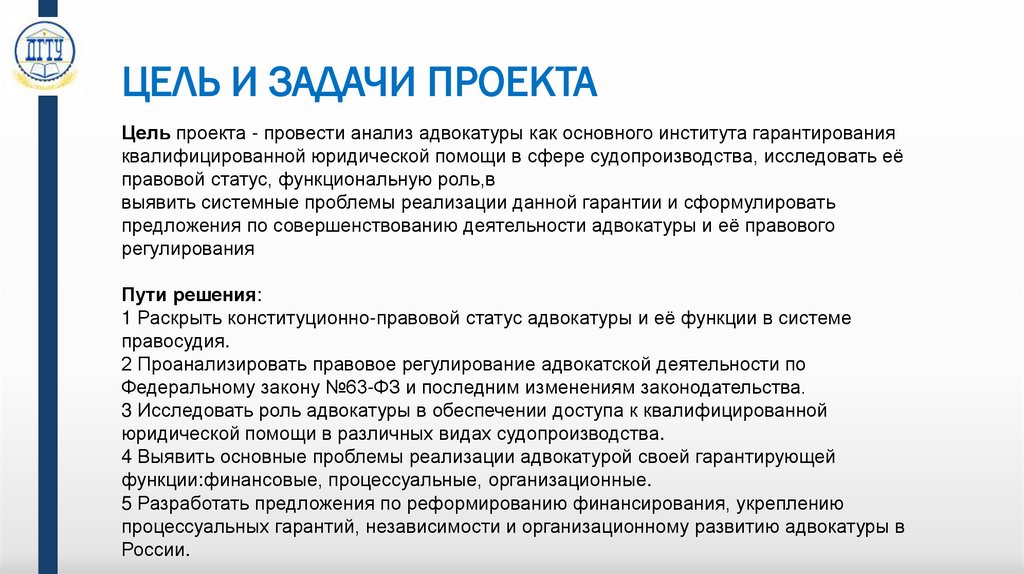 ЦЕЛЬ И ЗАДАЧИ ПРОЕКТАЦель проекта - провести анализ адвокатуры как основного института гарантирования
