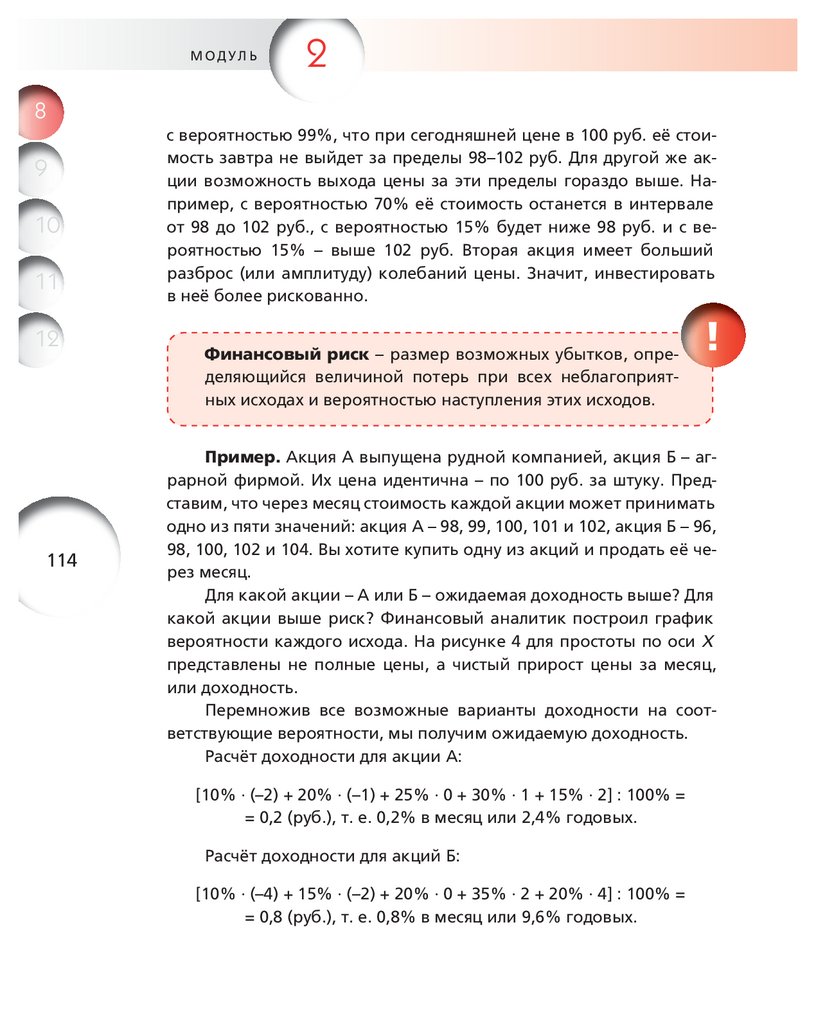 от 98 до 102 руб., с вероятностью 15% будет ниже 98 руб. и с вероятностью 15% – выше 102 руб. Вторая акция имеет больший