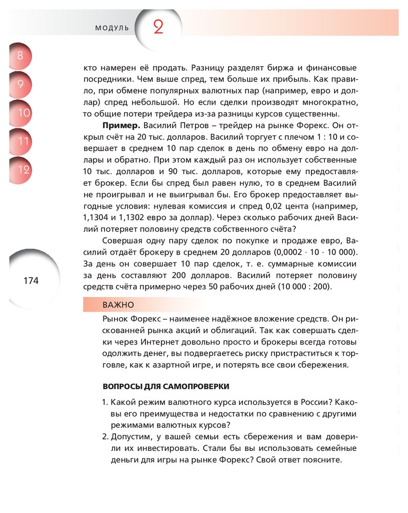 Совершая одну пару сделок по покупке и продаже евро, Василий отдаёт брокеру в среднем 20 долларов (0,0002 · 10 · 10 000).
