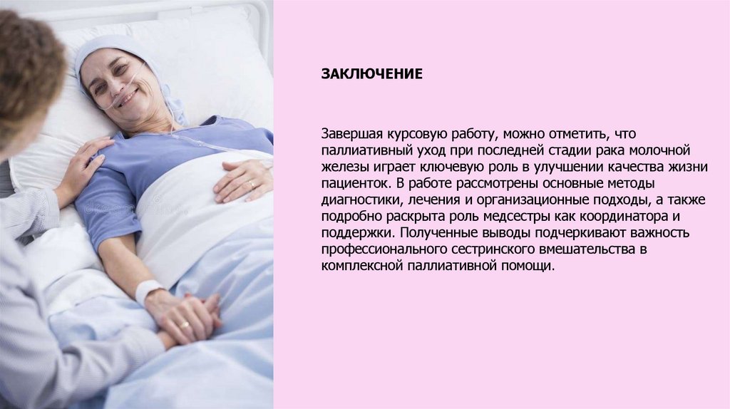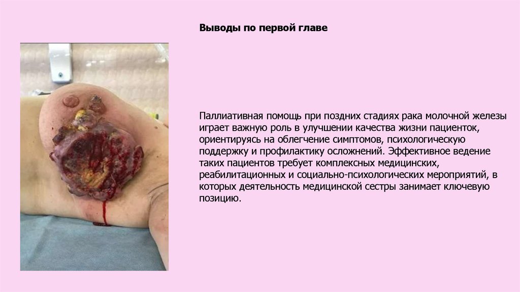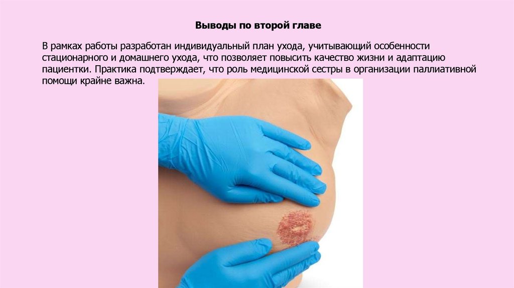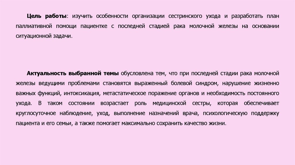 Цель работы: изучить особенности организации сестринского ухода и разработать планпаллиативной помощи пациентке с последней стадией рака молочной железы на основании