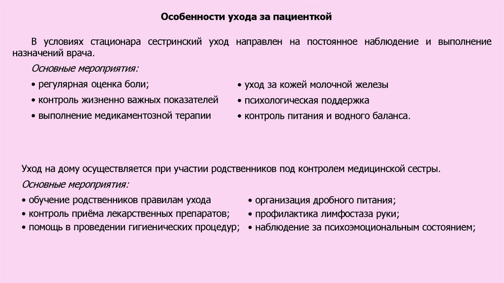 Особенности ухода за пациенткойВ условиях стационара сестринский уход направлен на постоянное наблюдение и выполнение