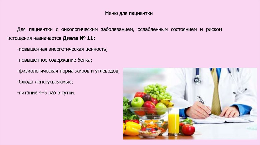 Меню для пациенткиДля пациентки с онкологическим заболеванием, ослабленным состоянием и риском