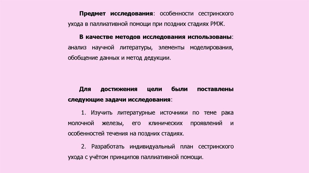 Предмет исследования: особенности сестринскогоухода в паллиативной помощи при поздних стадиях РМЖ.