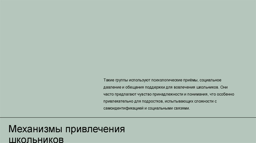 Такие группы используют психологические приёмы, социальноедавление и обещания поддержки для вовлечения школьников. Они