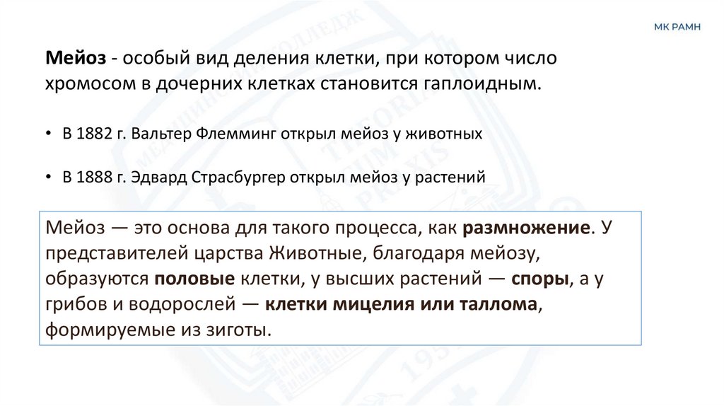 • В 1882 г. Вальтер Флемминг открыл мейоз у животных