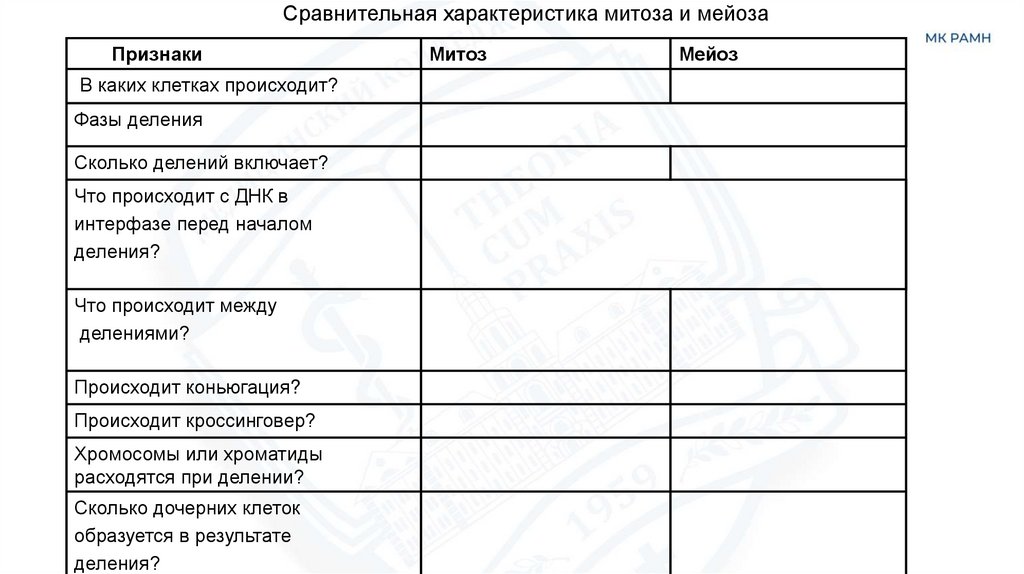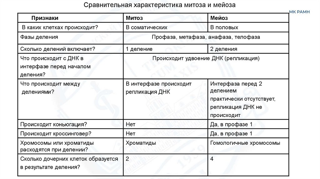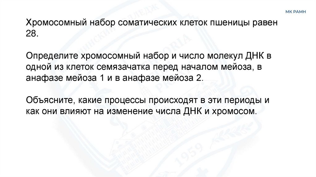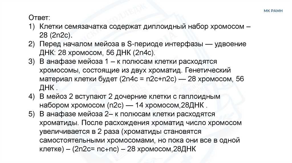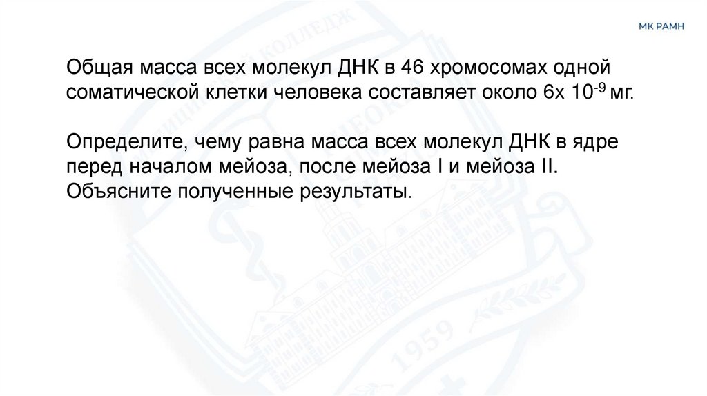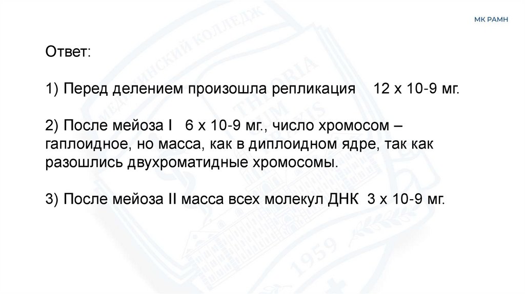 2) После мейоза I 6 x 10-9 мг., число хромосом –
