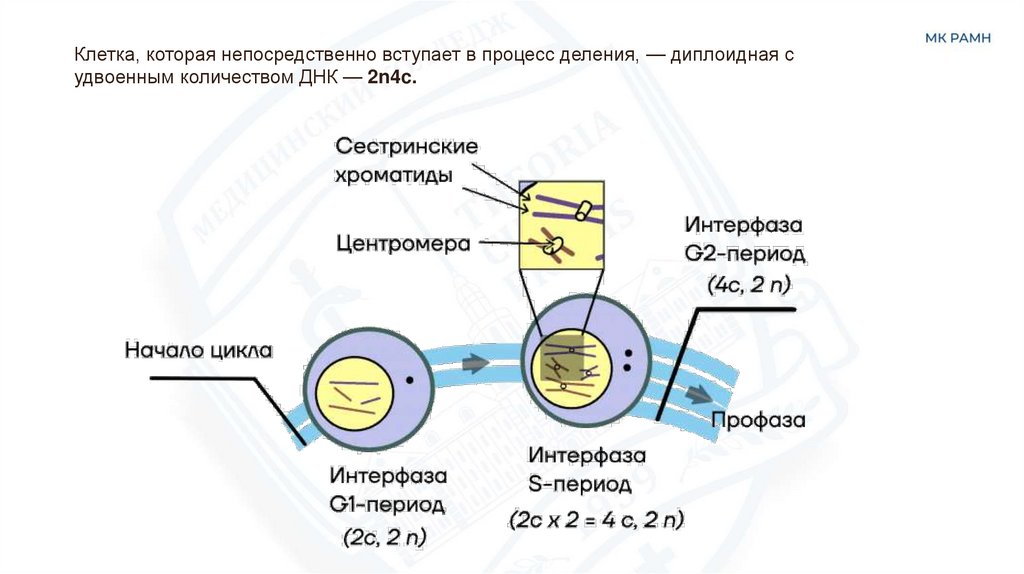 Клетка, которая непосредственно вступает в процесс деления, — диплоидная судвоенным количеством ДНК — 2n4c.