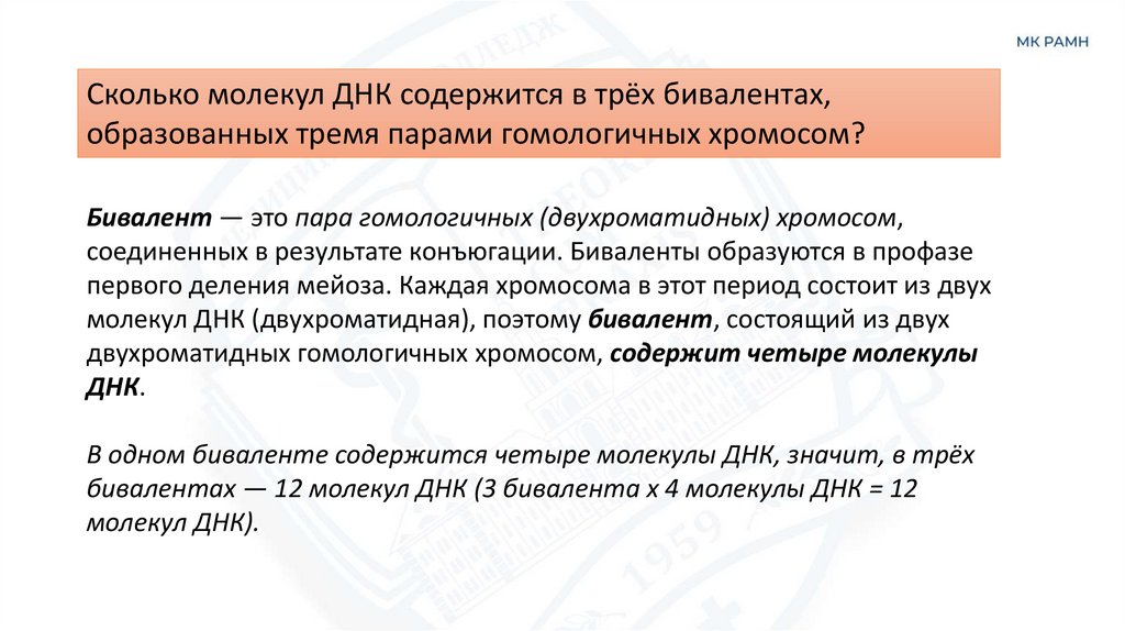бивалентах — 12 молекул ДНК (3 бивалента x 4 молекулы ДНК = 12