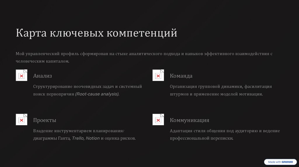 Карта ключевых компетенцийМой управленческий профиль сформирован на стыке аналитического подхода и навыков эффективного взаимодействия с