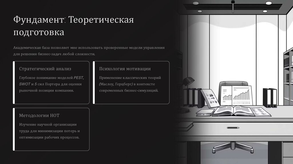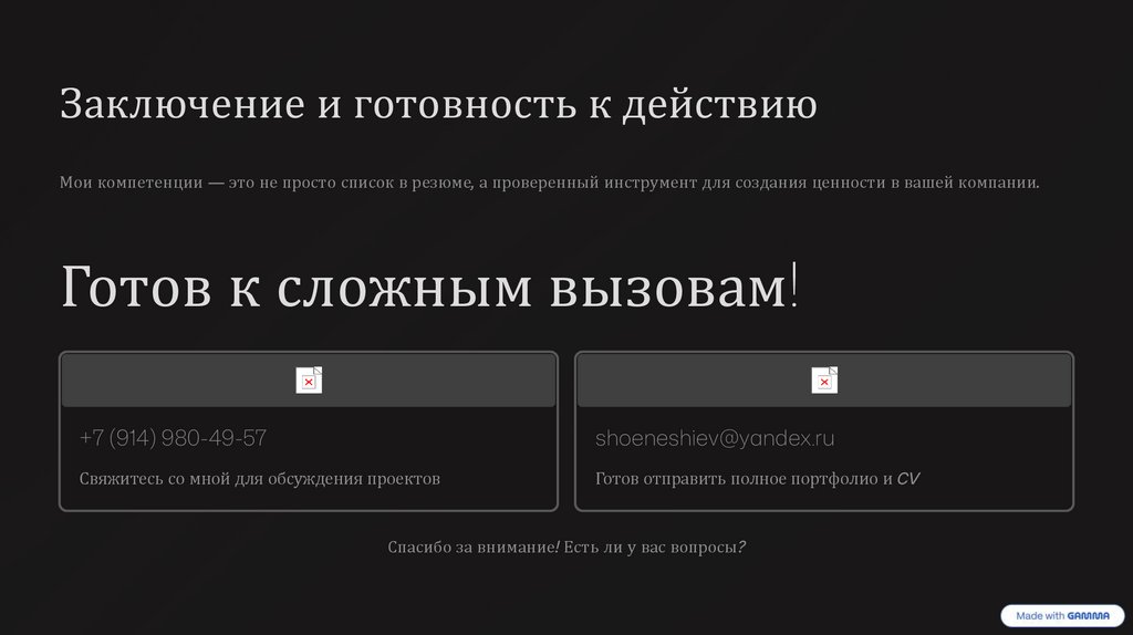 Заключение и готовность к действиюМои компетенции — это не просто список в резюме, а проверенный инструмент для создания ценности в вашей компании.