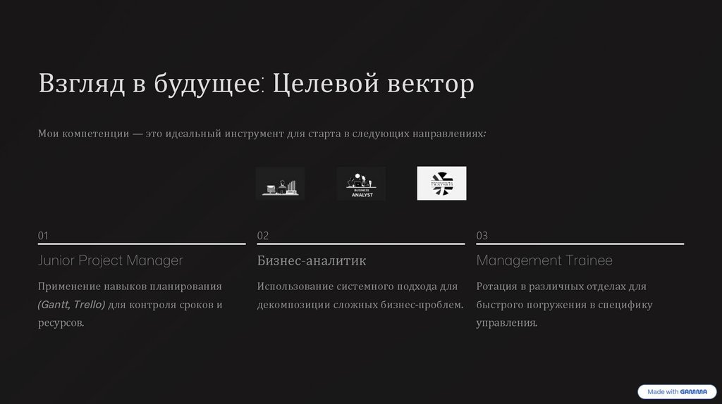 Взгляд в будущее: Целевой векторМои компетенции — это идеальный инструмент для старта в следующих направлениях: