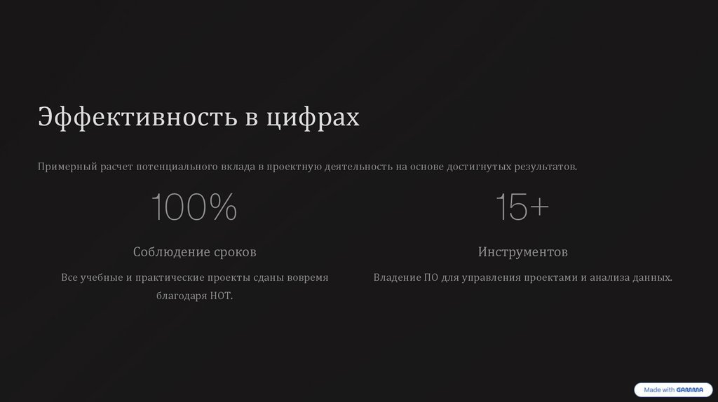 Эффективность в цифрахПримерный расчет потенциального вклада в проектную деятельность на основе достигнутых результатов.