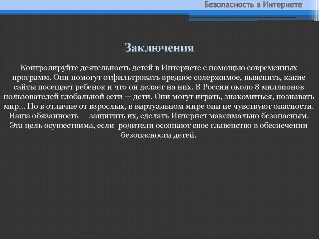 ЗаключенияКонтролируйте деятельность детей в Интернете с помощью современных