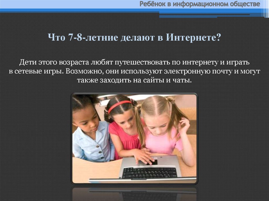 Что 7-8-летние делают в Интернете?Дети этого возраста любят путешествовать по интернету и играть