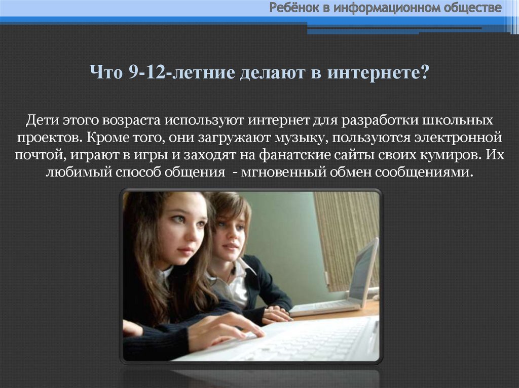 Что 9-12-летние делают в интернете?Дети этого возраста используют интернет для разработки школьных