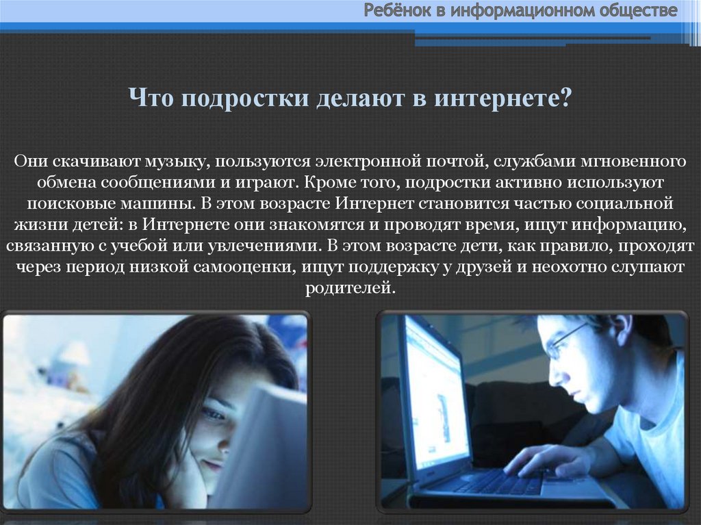 Что подростки делают в интернете?Они скачивают музыку, пользуются электронной почтой, службами мгновенного
