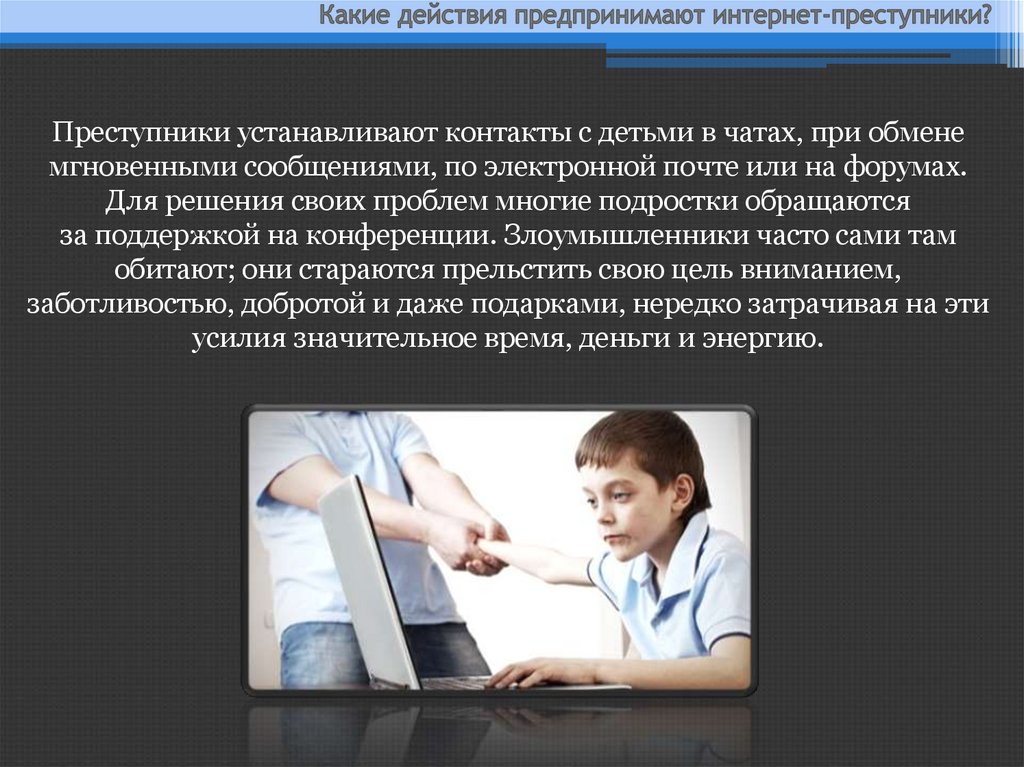 Преступники устанавливают контакты с детьми в чатах, при обменемгновенными сообщениями, по электронной почте или на форумах.