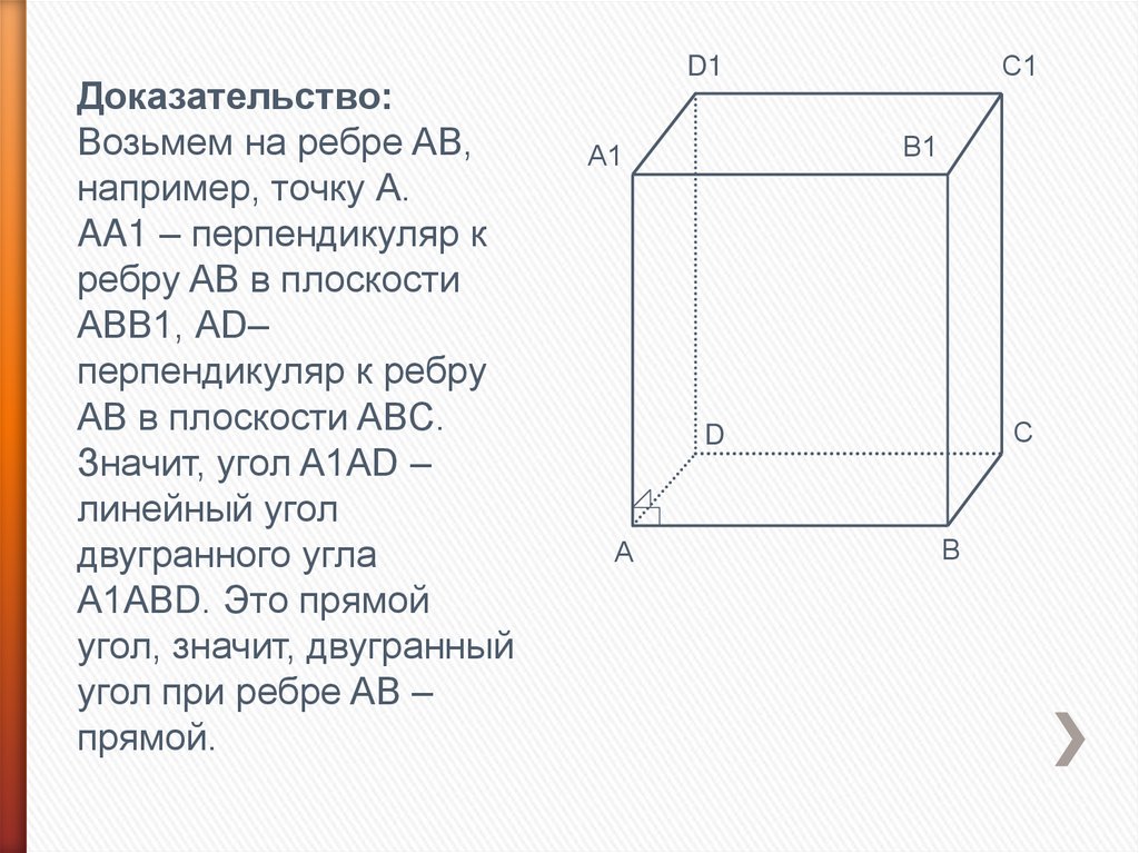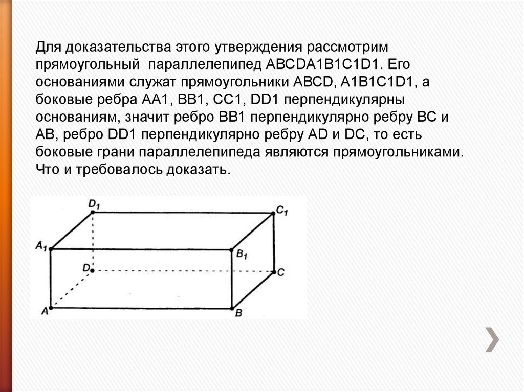 Для доказательства этого утверждения рассмотримпрямоугольный параллелепипед АВСDА1B1C1D1. Его