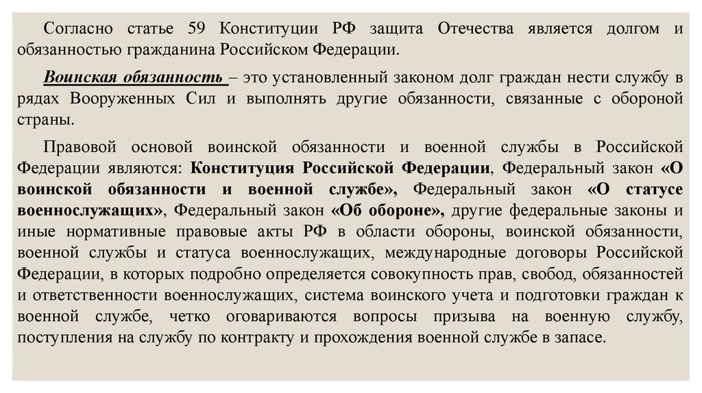 Согласно статье 59 Конституции РФ защита Отечества является долгом иобязанностью гражданина Российском Федерации.