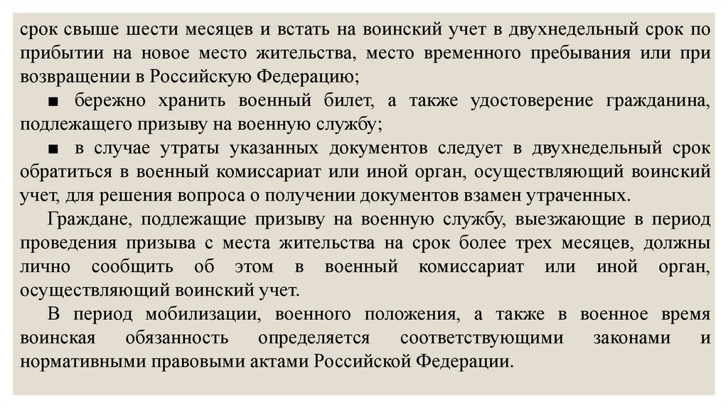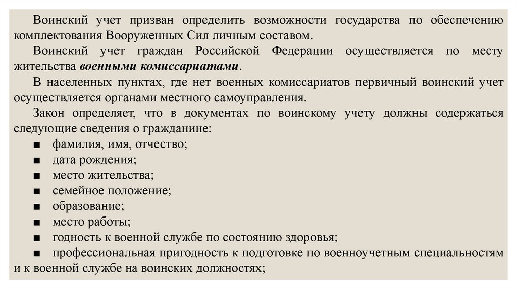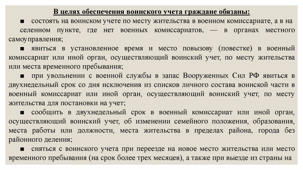 В целях обеспечения воинского учета граждане обязаны:■ состоять на воинском учете по месту жительства в военном комиссариате, а в на